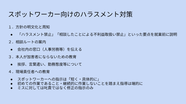 「今日だけの人だし・・・」といった油断があると、指示が乱暴になったり、ちょっとした内輪の冗談が通じず相手を不快な気持ちにさせることもあるかもしれません。一方、スポットワーカーが加害側になる可能性もゼロとは言い切れません。採用過程でじっくりと人柄をみる機会がなく当日どんな人が来るのか予見できないことを踏まえると、企業は既存の従業員・スポットワーカーの双方を守るためのハラスメント対策を行うことが求められます。